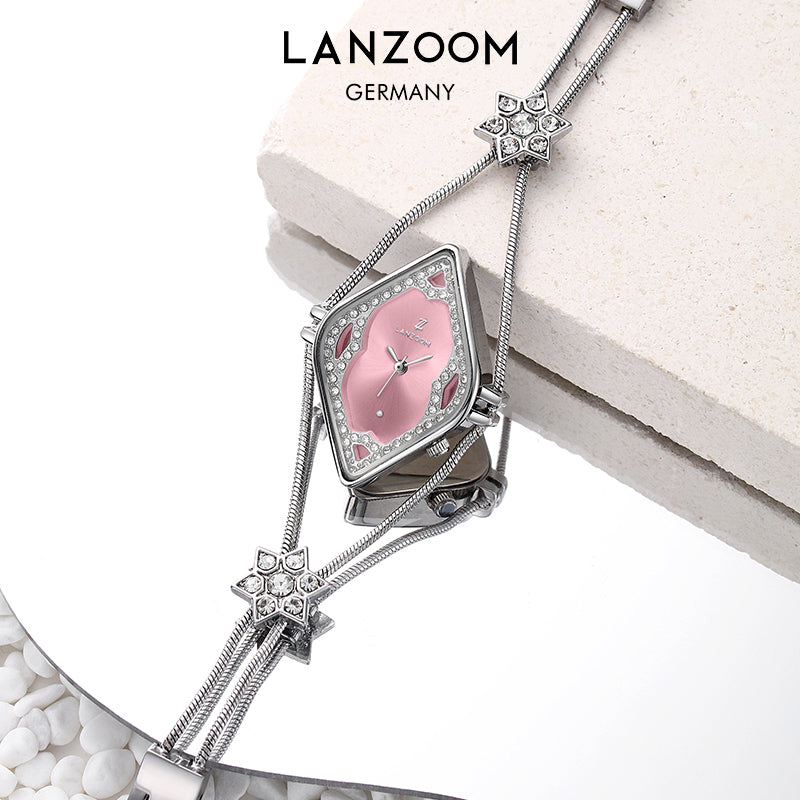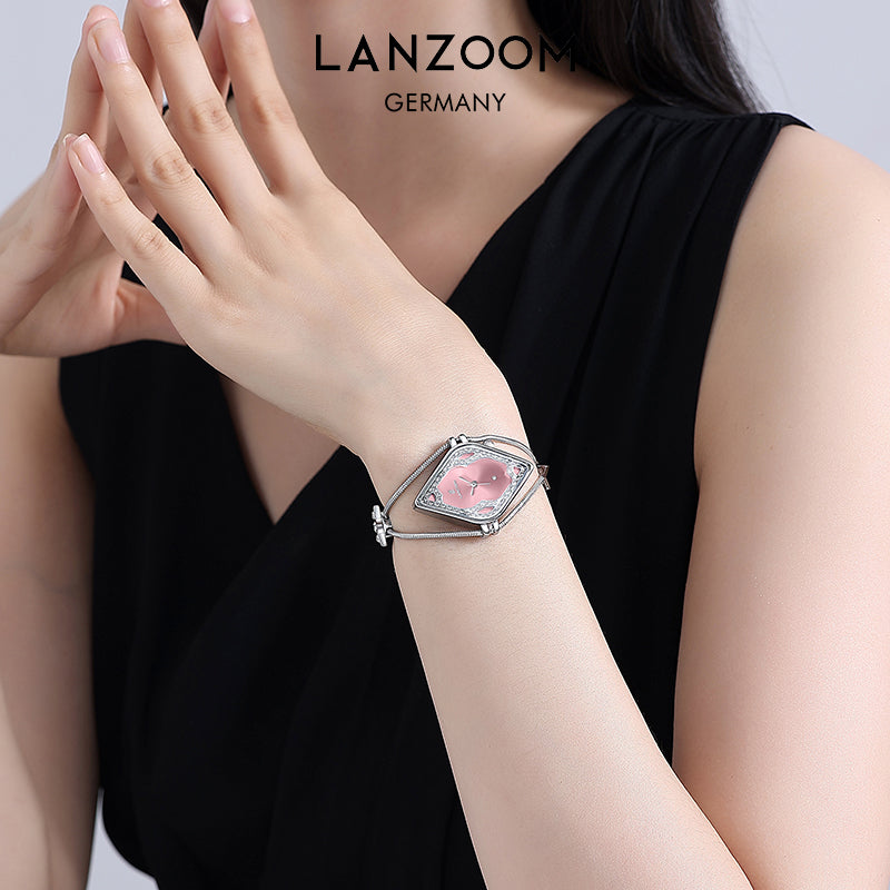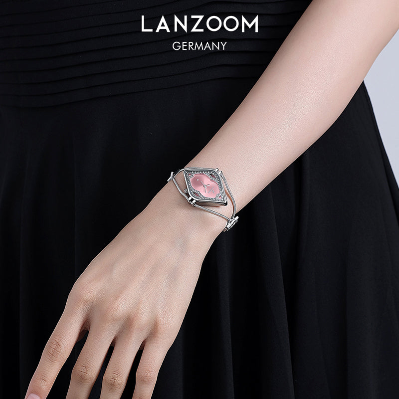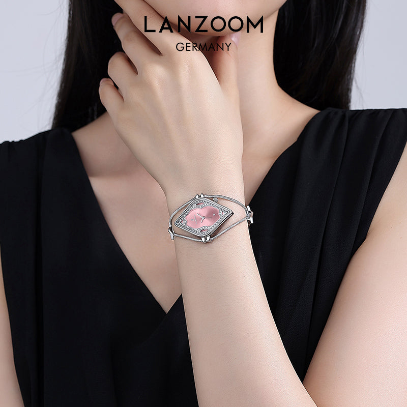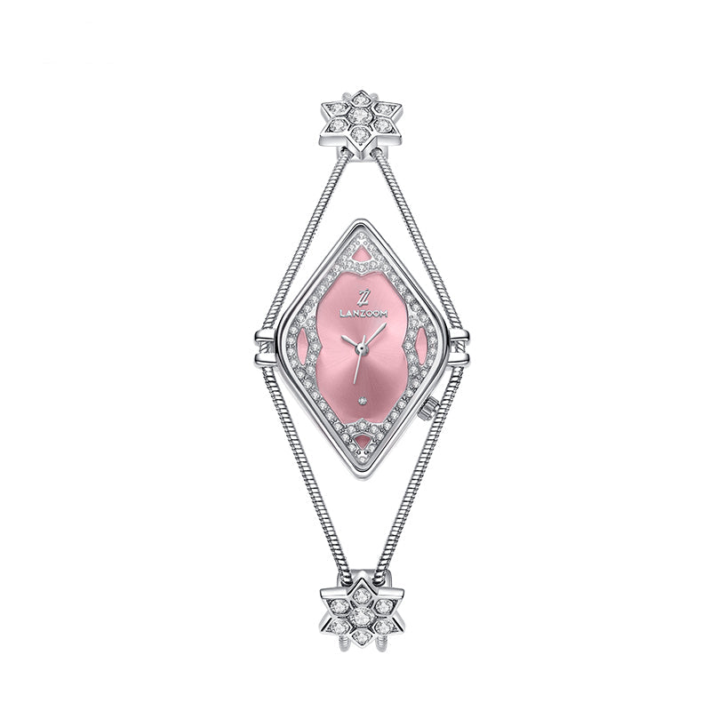 This watch, with its striking geometric aesthetics, recreates the captivating charm of a bygone era. The openwork rhombus dial, paired with a dazzling pink radial metal base, creates a mesmerizing interplay of light and shadow. A circle of exquisite cubic zirconia stones surrounds the dial, radiating a brilliant sparkle, as if you were at a glamorous ball.